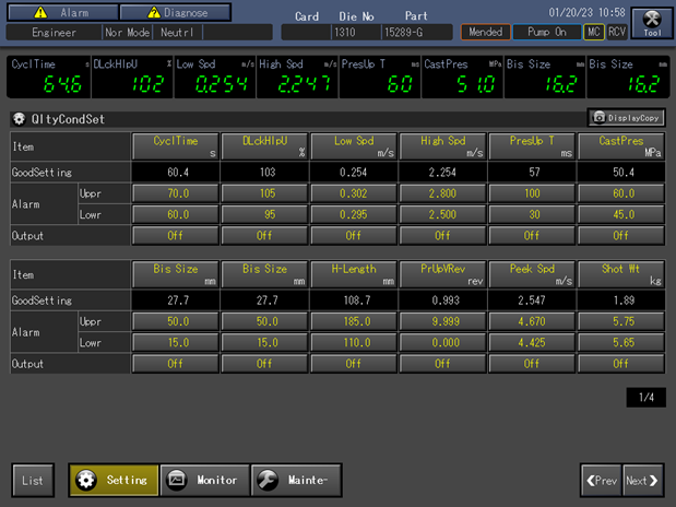 Contact the Die Casting Team to learn more about setting up specific parameters on the Quality Conditions Set Page. These settings are then reflected on the Line Display page, allowing operators to have a clear and organized visual representation of the current conditions of the die-casting process and take action if needed.