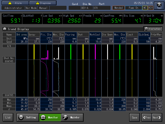 The trend display page in TOSCAST provides statistical variation analysis, offering valuable insights into the casting process. This data-driven approach helps identify areas for improvement, optimize process parameters, and maintain tight control over temperature fluctuations.