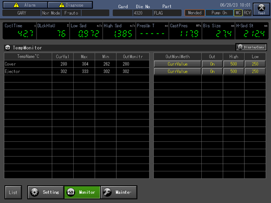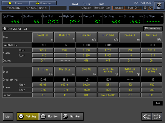 The system's integration with the die casting machine facilitates comprehensive data display, allowing operators to view temperature-related parameters. The quality setup page allows the ranging of temperatures for quality assessment, enabling the identification of acceptable ranges and triggering warnings for deviations. Auxiliary systems, such as heating coils and water cooling, can be controlled based on temperature limits on the temperature monitoring page, enhancing overall process efficiency.