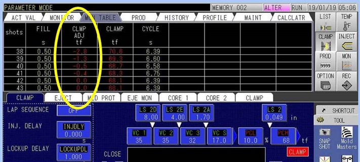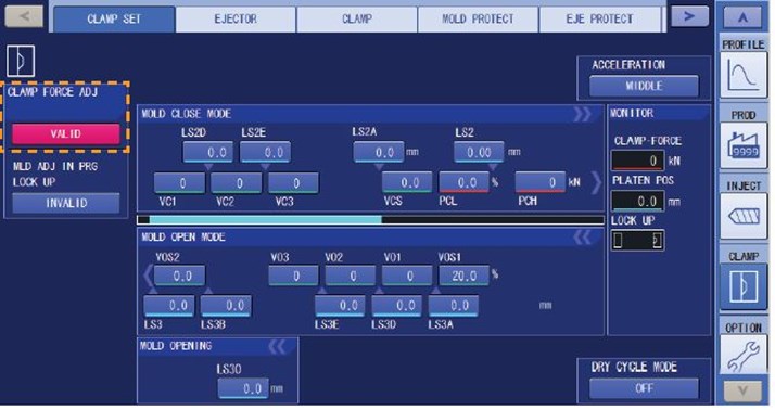 The setting procedure is straightforward and simple with the easy to use V70 controller on the Shibaura Machine ECSXIII series. By pressing the CLAMP menu, you can go into the settings to start operations. The screen also offers actual clamp force data per shot via the TABLE screen. This screen improves monitoring capabilities with simple tracking of your machine's clamp adjustments.