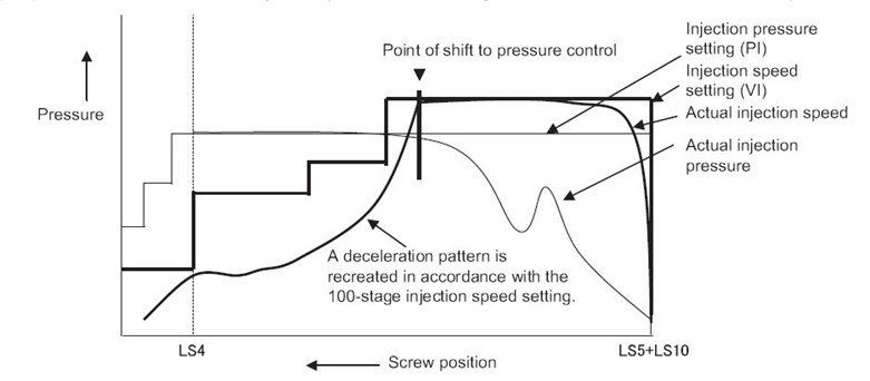 Shibaura Machine’s all-electric injection molding machines offer a Laminar Control function which helps alleviate issues when running a “pressure limited” process. What is a “pressure limited” process?. When the resin pressure rises during the filling process and reaches the filling pressure setting (PI), shifting from speed control to pressure control. The filling at constant pressure means uncontrolled filling speed creating inconsistencies in the repetition of the deceleration of the speed filling the cavities. The Laminar Control internally records the filling speed deceleration pattern and controls the filling speed so that it follows this pattern. This stabilizes the repeated filling speed when under pressure control.