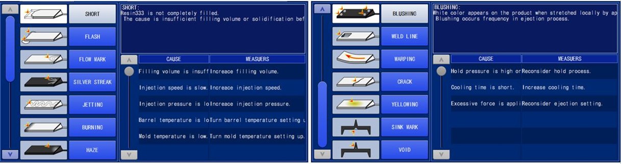 For example, if the part is not completely filled, it will explain the cause and offer appropriate measures to take in order to fix this molding defect.
