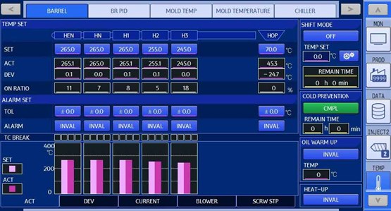 - Heater break display: reduce molding defects caused by faulty barrel temperature by being able to immediately sense when the barrel heater is disconnected, and locate the disconnected heater.
