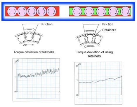 This allows for retainers to assist in holding lubrication, improved durability and efficiency because of less friction between balls, and reduced noise levels due to the retainers stopping rolling ball impact.