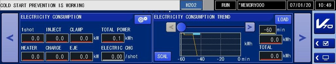 Armed with the data from the Energy Consumption monitoring tool on the V70 controller, users are able to take action to further reduce energy consumption and improve efficiency. This tool breaks down power consumption from the injection, clamp, barrel heaters, ejection, and charge. It also allows for users to pull up the average electric power of 1 shot per cycle and the electricity rate in one of the following settings: