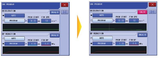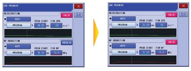 The program allows the operator to control the screw back pressure during charging so that it increases or decreases pressure before the charge complete position.