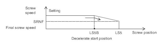 Creating a stable melt and realizing a smooth transition from one set point to another can be produced by controlling the screw rotation speed. The Screw Rotation Speed Program allows the operator to control the speed during charging so that it accelerates or decelerates before the charge complete position. Operators can also set the screw rotation speed, decelerate start position, and final screw speed.