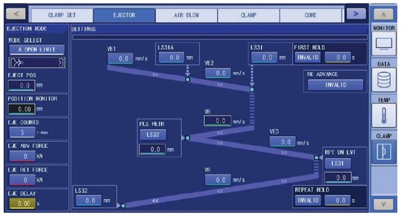 By using an independent electric servo motor for ejection, the Eject Monitor feature allows users instant insight into the torque and capabilities to help prevent mold damage that hydraulic systems do not. Namely, the user can not only monitor the ejector servo motor torque during ejection, but also set a torque limit on the ejectors. In using this feature, it will help better prevent mold damage when mold components are worn or binding and can easily detect ejection error due to overpacking parts, worn ejector pins and mechanical lifters, etc. and immediately stops the ejector advance operation when an error is detected.