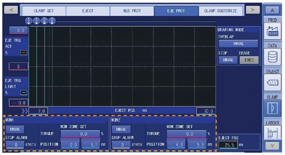 Additionally, operators can monitor the torque in two zones. This allows the eject operation to set limits on the retract limit and advance limit. The eject operation will stop when the detected torque in the desired monitoring zone (1 or 2) exceeds its limit settings. The zones will automatically be returned to the retract limit after eject operation is stopped due to an error detection and an alarm will display alerting the operator to what zone an ejection error has occurred.