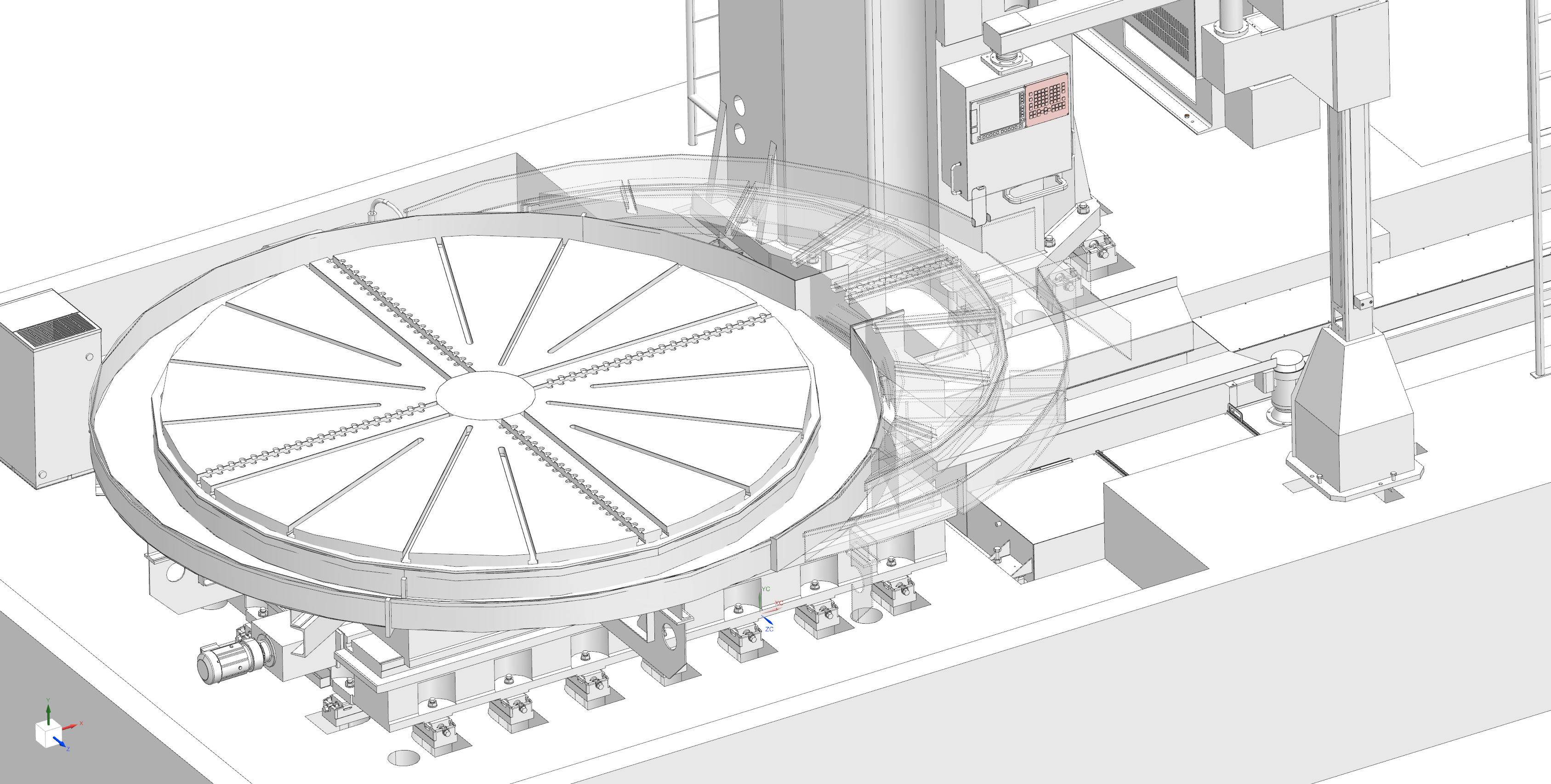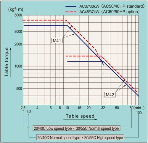 The high table weight capacity is supported by a high-precision thrust cylindrical roller bearing and a tapered roller bearing. The table is driven by the main motor and a large diameter helical gear. Table speed is managed by a two-range hydraulic shifter and AC motor control.
